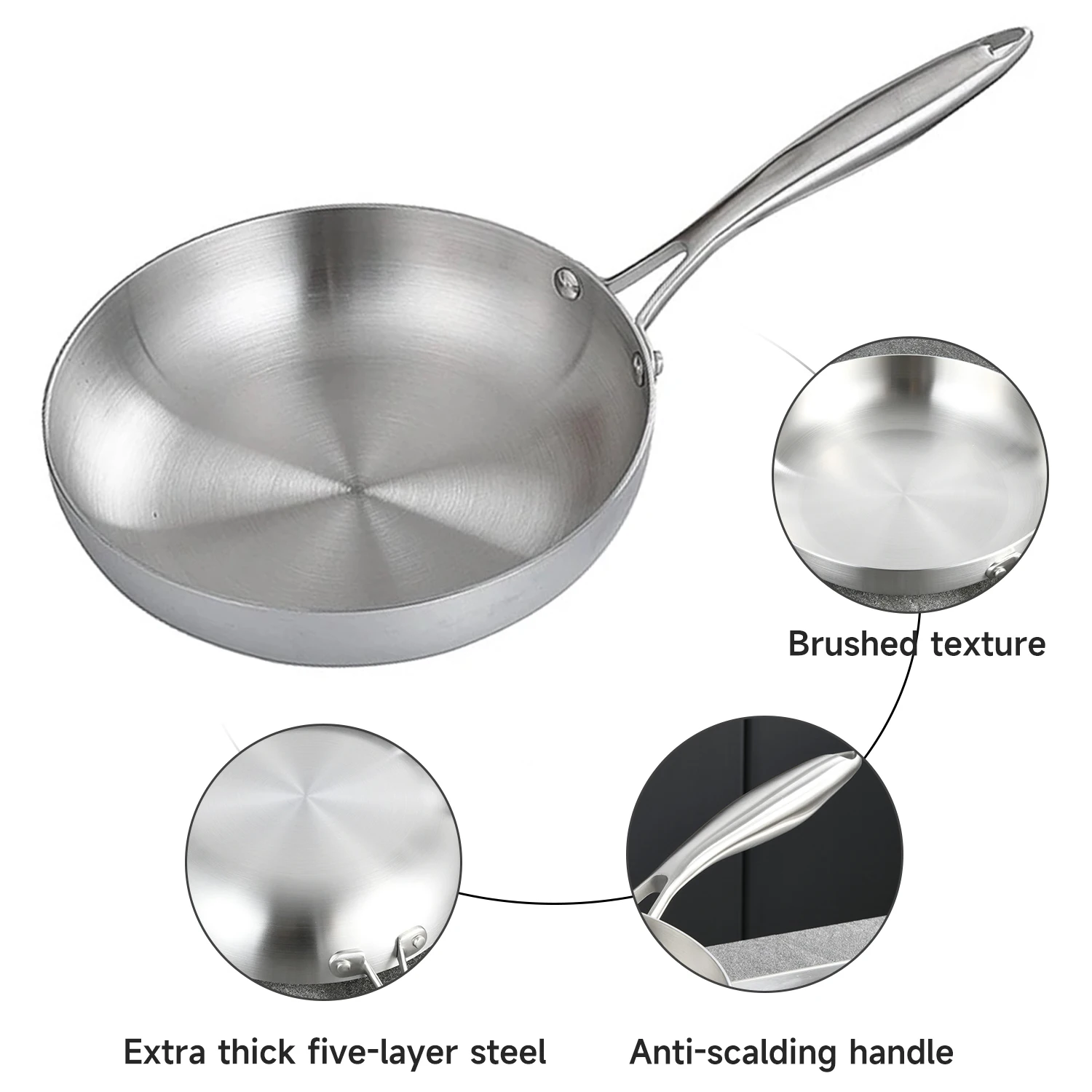 【Fully Clad For Even Heating】This cooking pan has a 3-ply fully clad construction, which combines layers of metal for enhanced heat conductivity and durability. Three inner layers of aluminum ensure even and efficient heating across the entire body of the pan.